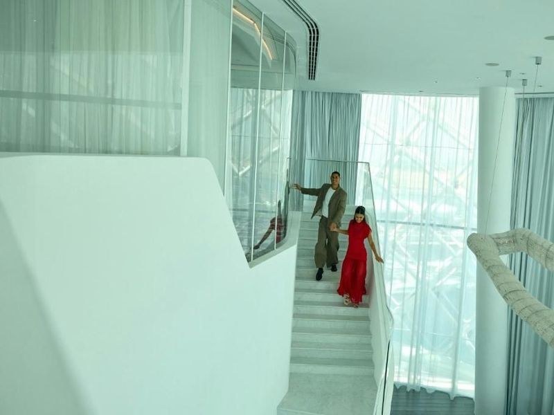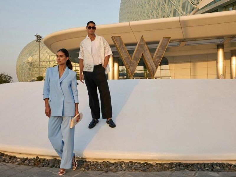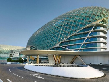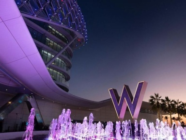 Отель состоит из двух 9-этажных зданий с современной архитектурой и ярким дизайном в стиле бренда W. Собственного пляжа нет, но бесплатный трансфер на Yas Beach обеспечивает удобный доступ к морю. На территории — два открытых бассейна: основной с зоной для взрослых и отдельный детский. Бассейн на крыше (WET Deck) работает только для взрослых и предлагает панорамный вид на залив и трассу.